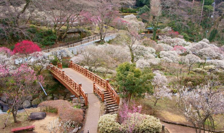 熱海梅園は、四季折々の花々が楽しめる歴史ある日本庭園で、愛犬と一緒にリードをつけて散策できる自然豊かなスポットです。