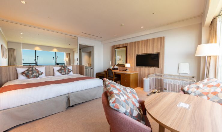 全100室ある客室は全てオーシャンビューです。相模灘を一望でき、どこまでも続く水平線を眺めながらゆったりとお過ごしいただけます。朝には大きな窓から朝陽が差し込み、開放的で心地よい目覚めのひと時を迎えます。愛犬も嬉しい明るく広々としたお部屋です。