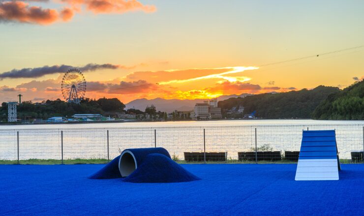 浜名湖の湖畔にある「DOG PARK」は青い人工芝のドッグランで、湖上を駆け回るかのような愛犬の姿を見ることができるかも。