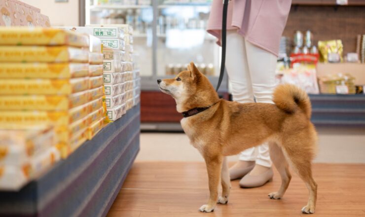 愛犬と一緒に売店でお土産探し